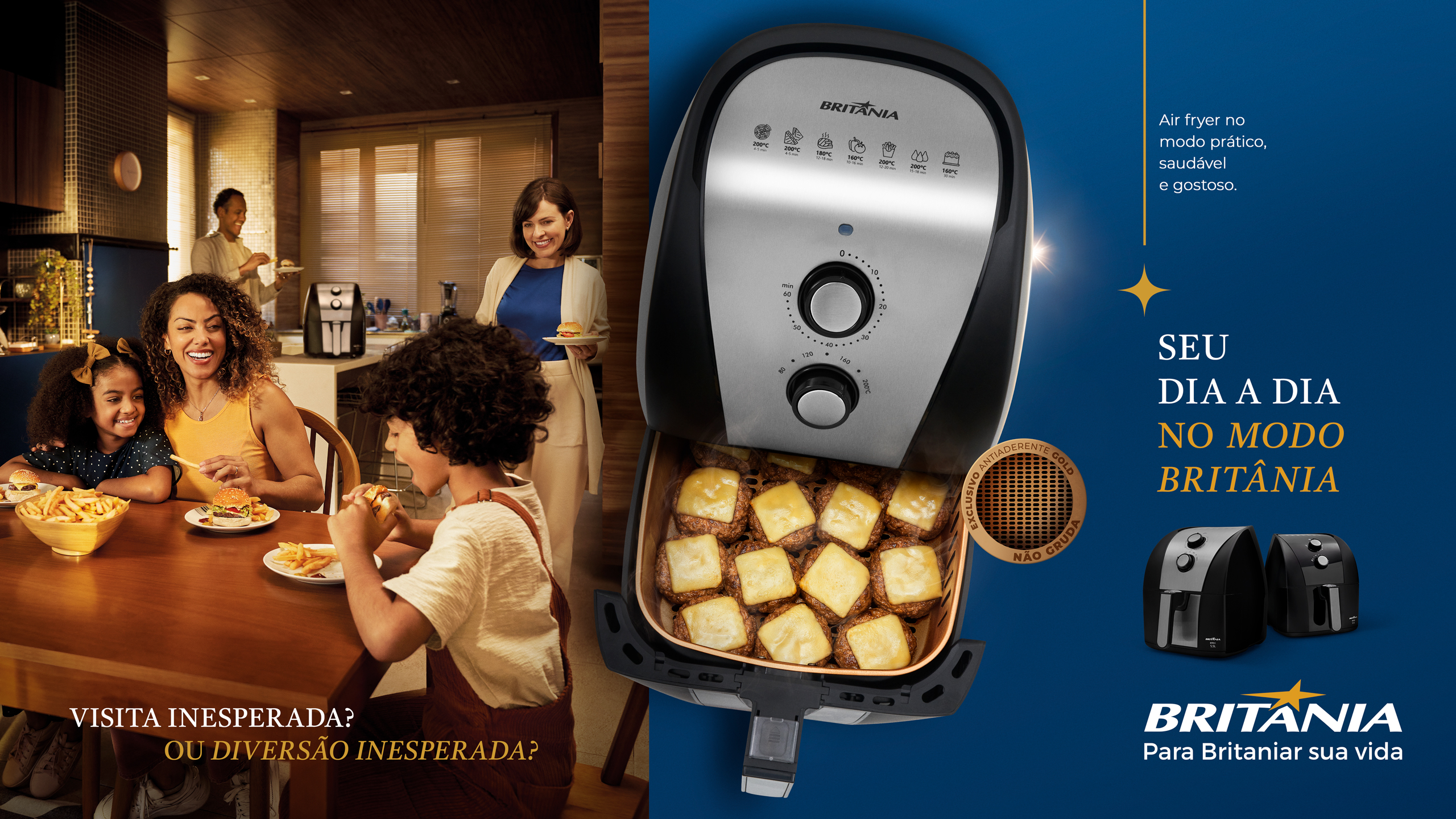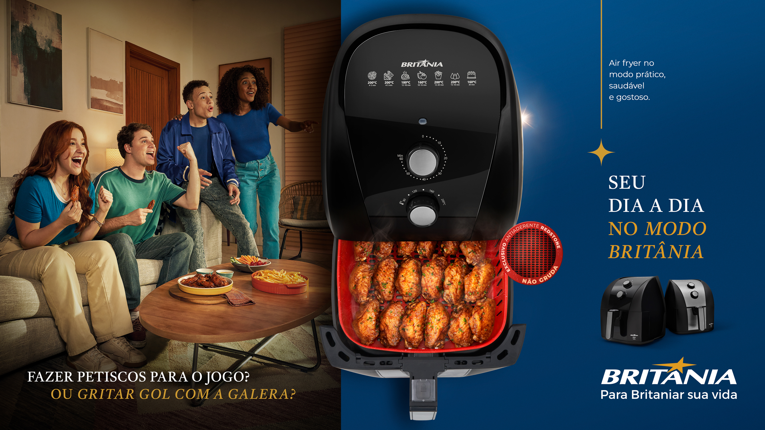 Para estreitar relações com o público e destacar os novos modelos de Air Fryers Britânia, criamos uma estratégia de divulgação de marketing 360º. Com o conceito “Seu dia a dia no modo Britânia”, a campanha traz uma comunicação interativa, inovadora e que proporciona experiências diferenciadas para os brasileiros. As novidades começam com o lançamento dos novos modelos de Air Fryers, BFR50 e BFR51, que oferecem revestimentos exclusivos e cestos que cabem mais, ideais para preparar grandes quantidades de alimentos sem empilhar.